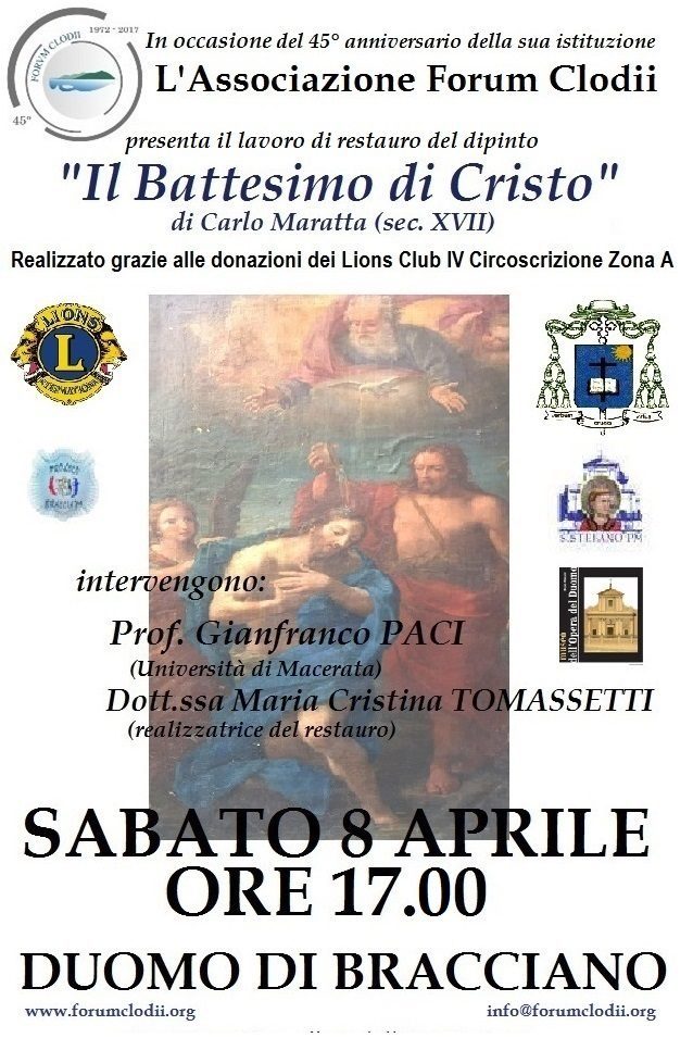 Sabato 8 aprile alle ore 17.00 presso il Duomo di Bracciano, l’Associazione Forum Clodii di Bracciano festeggerà il 45̊ anniversario della sua istituzione, presentando il restauro del dipinto “Il Battesimo di Cristo” di Carlo MARATTA (sec. XVII). Interverranno il prof. Gianfranco PACI (Università di Macerata), socio fondatore della Forum Clodii e la restauratrice del dipinto, la dott.ssa Maria Cristina TOMASSETTI (restauratrice del dipinto). Il restauro è stato realizzato grazie alle donazioni dei Lions Club, IV Circoscrizione Zona A.