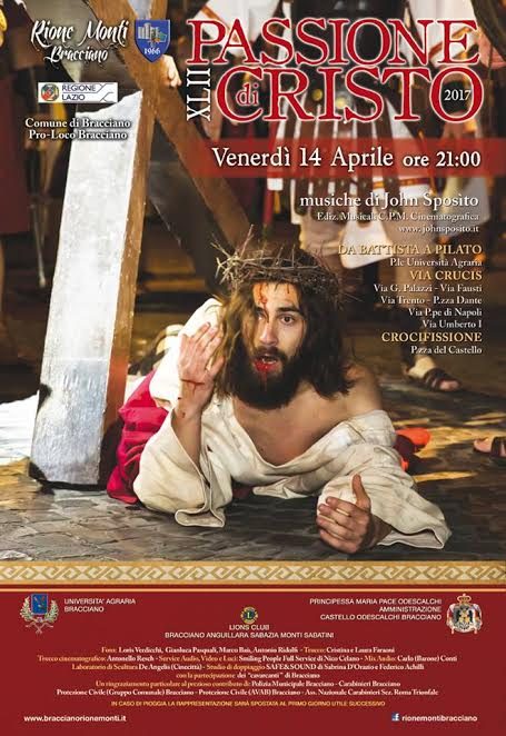 Venerdì 14 aprile, alle ore 21.00, si assisterà al processo che si terrà a Piazzale Enzo Negri (Università Agraria), seguito dalla Via Crucis che culminerà in Piazza Mazzini dove gli spettatori potranno assistere alla Crocifissione. Tra effetti speciali, musiche, lo scenario incantevole del Castello ed il lavoro appassionato di attori, costumisti e truccatori, avrà luogo uno degli eventi più caratteristici della cultura di Bracciano.