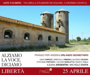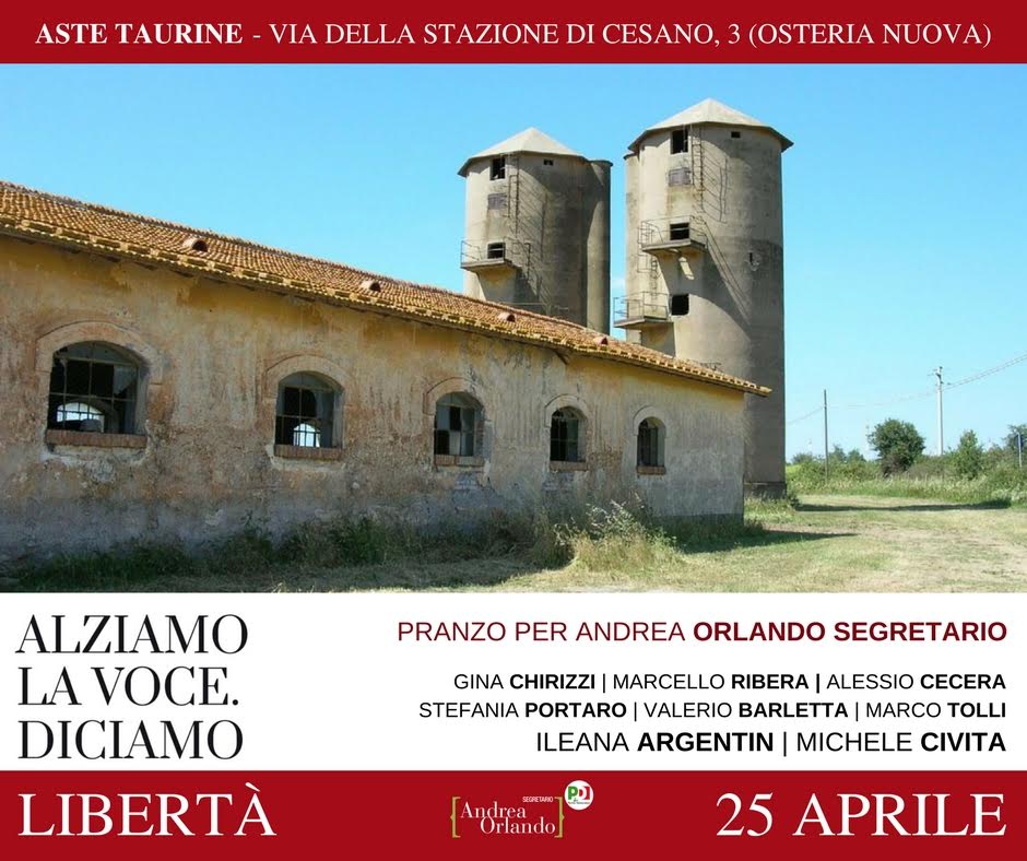 Alziamo la voce, diciamo libertà: martedì 25 aprile, presso le Auste Taurine, via della stazione di Cesano 3 (Osteria Nuova), un pranzo per sostenere Andrea Orlando, candidato segretario alla primarie del Partito Democratico. Intervengono Gina Chirizzi, Marcello Ribera, Alessio Cecera, Stefania Portaro, Valerio Barletta, Marco Tolli, Ileana Argentina, Michele Civita.