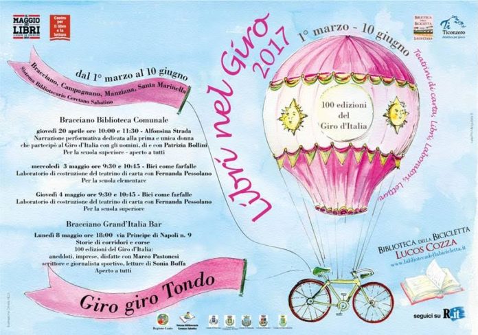 Nel 2017 il Giro d’Italia diventa centenario, non di anni (nacque nel 1909) ma di edizioni (ne saltò quattro per la Prima guerra mondiale e cinque per la Seconda). La Biblioteca della Bicicletta Lucos Cozza in collaborazione con l’artista Fernanda Pessolano per l’associazione Ti con Zero celebra il Giro d’Italia con “Giro giro Tondo”, quarta edizione di “Libri nel Giro” e organizza, in collaborazione con la Biblioteca Comunale di Bracciano, diversi appuntamenti a maggio nella cittadina lacustre.