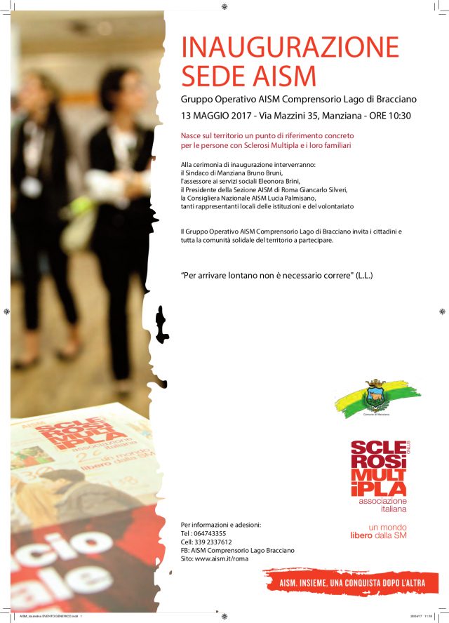 A livello comprensoriale non c’era un punto di riferimento, di informazione, assistenza e aggregazione: grazie alla collaborazione di tutti il 13 maggio questo vuoto sarà riempito, mostrando ancora una volta la sensibilità di Manziana per le tematiche sociali. Spero davvero – continua l’Assessore Brini – che sabato saremo in tanti a partecipare e che questo sia solo il primo passo di un grande cammino, consapevoli che, come recita il motto dell’AISM Roma, “per arrivare lontano non è necessario correre”