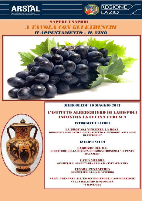 Nell’ambito del Progetto di Educazione al consumo consapevole “Sapere i Sapori: a tavola con gli Etruschi”, realizzato in collaborazione con A.R.S.I.A.L. (Agenzia Regionale per lo Sviluppo e l’Innovazione dell’Agricoltura del Lazio), mercoledì 10 maggio 2017, dalle 9 alle 14, nel Laboratorio Linguistico dell’Istituto Alberghiero di Ladispoli, si svolgerà il secondo seminario dedicato alla viticoltura etrusca e ai vini del territorio cerite. Aprirà i lavori la Dirigente Scolastica dell’Istituto Superiore “Giuseppe Di Vittorio”, Prof.ssa Vincenza La Rosa. Seguiranno gli interventi di Fabrizio Del Re, Direttore della rivista di enogastronomia ‘Il Punto Magazine’, Catia Minghi, Sommelier e segretaria della F.I.S.A.R. (Federazione Italiana Sommelier Albergatori e Ristoratori) di Civitavecchia e Cesare Pennacchia, Sommelier della F.I.S.A.R. Viterbo. All’incontro saranno presenti anche alcuni rappresentanti dell’Associazione Culturale-Archeologica “I Rasenna”.