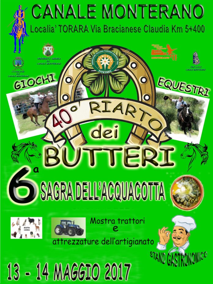 Sabato 13 e domenica 14 maggio, il 40° Riarto dei Butteri, l’appuntamento annuale con l’evento organizzato dall’Ass. Butteri di Canale Monterano. La festa dei Butteri del 2017 prevede due giornate all’insegna dei giochi di abilità e destrezza tra cavalieri, spettacoli, dimostrazioni equestri e tanto altro, il tutto all’interno di uno spettacolare ambiente immerso nel verde.