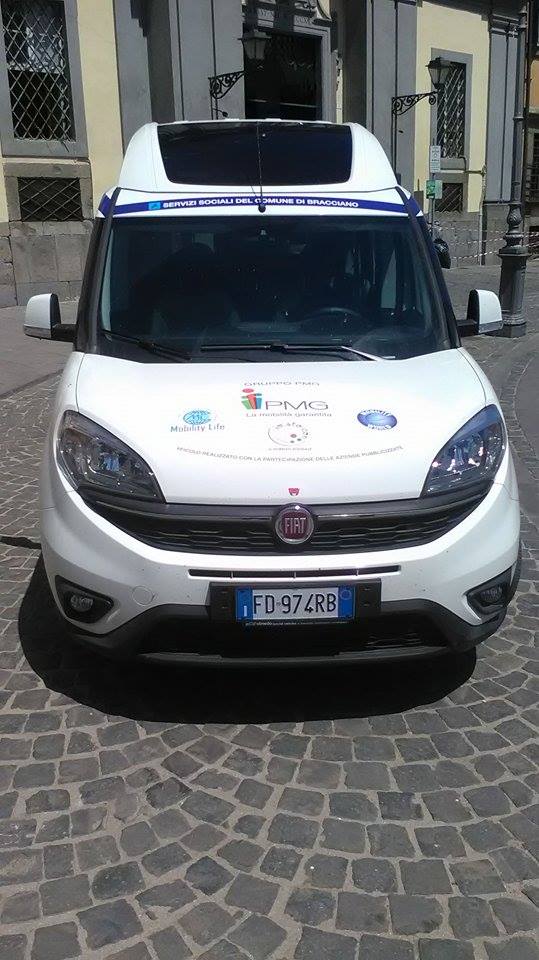 La Società MOBILITY LIFE SRL, a seguito della sottoscrizione del progetto ‘Liberi di Essere, Liberi di Muoversi’” ha consegnato in data odierna al comune di Bracciano in regime di comodato gratuito n. 1 autoveicolo di marca FIAT modello DOBLO’ targato FD974RB, alimentazione a gasolio, idoneo per caratteristiche tecniche al trasporto di n. 4 passeggeri (autista escluso) ed attrezzato, con elevatore omologato a norma di legge, per il trasporto di n. 1 sedia a rotelle.