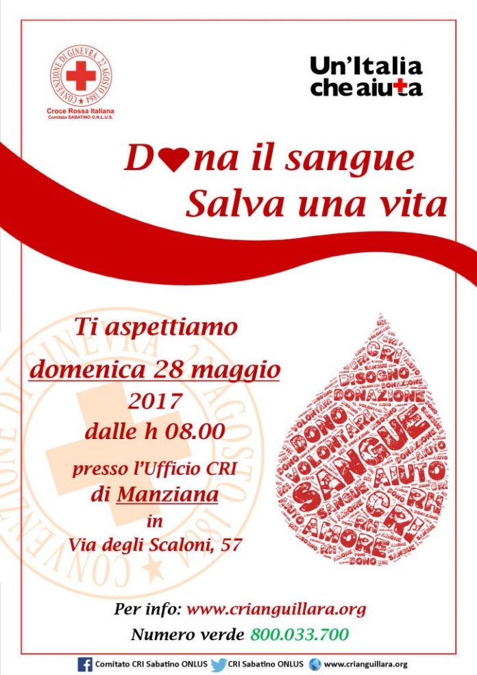 Domenica 28 maggio, dalle ore 8, presso l’ufficio della Croce Rossa in Via degli Scaloni, 57, il Comitato Locale Sabatino della Croce Rossa Italiana organizza una donazione di sangue.