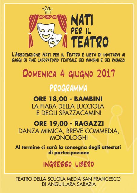 L’associazione “Nati per il teatro” presenta ad Anguillara Sabazia, il prossimo 4 giugno, presso il teatro della scuola media di San Francesco, i saggi di fine laboratorio teatrale dei bambini e dei ragazzi.