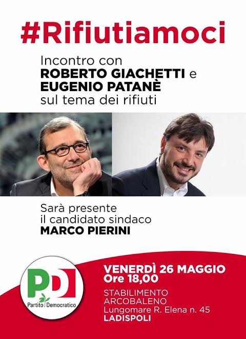 Sarà presente il candidato Sindaco dem alle Amministrative di giugno, Marco Pierini con la coalizione “Ladispoli protagonista”, che in più riprese ha promesso di difendere a spada tratta i diritti della città, perché “non siamo la discarica di nessuno”. Fate un cerchietto rosso alle vostre agendine, l’appuntamento con Giachetti e Patanè è per venerdì 26 maggio alle ore 18 nei locali dello Stabilimento Balneare Arcobaleno, Lungomare Regina Elena 45.