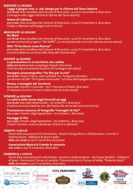 Da martedì 27 giugno a domenica 2 luglio 2017 si tiene a Bracciano la dodicesima edizione della “Festa del volontariato”. Si tratta di un incontro nel quale le associazioni della zona del lago di Bracciano propongono un momento di riflessione e di approfondimento. Il tema scelto quest’anno è: