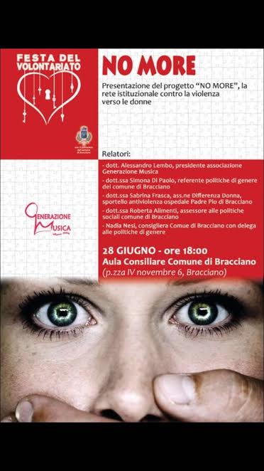 mercoledì 28 giugno a Bracciano, presentazione PROGETTO NO MORE, rete istituzionale contro la vilenza verso le donne