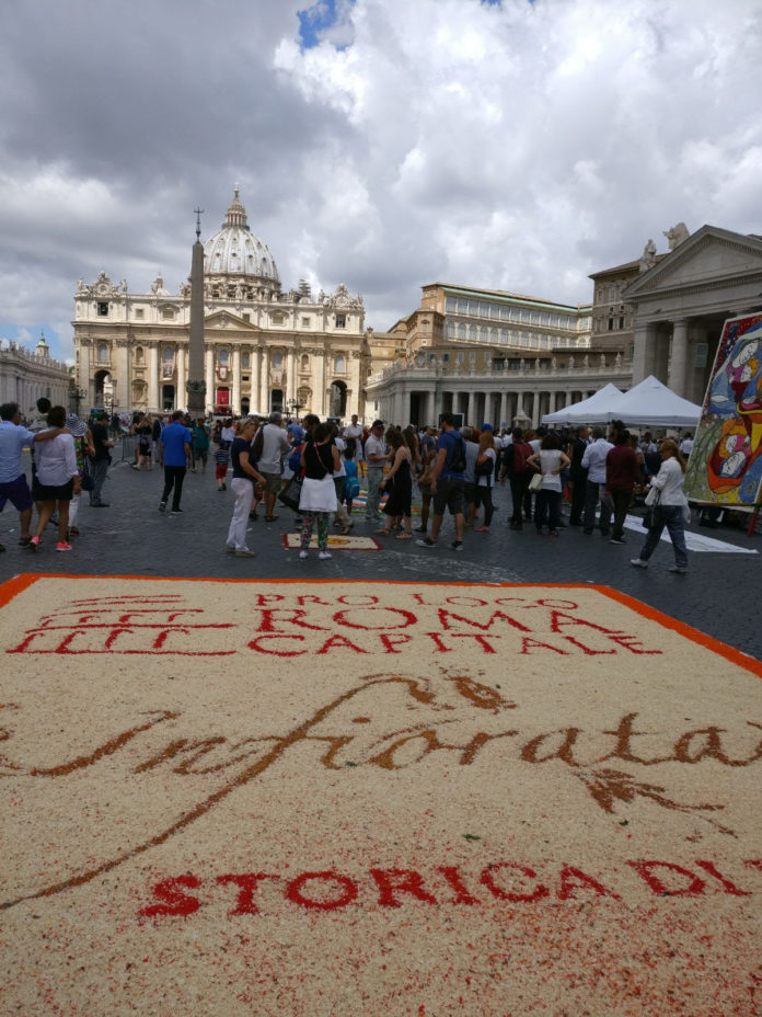 Ho provato una forte emozione – prosegue – nell’udire il ringraziamento che Papa Francesco ha tributato alla Pro Loco di Roma per l’iniziativa e per le belle rappresentazioni floreali”. L’infiorata è realizzata in occasione della festa in onore dei SS. Pietro e Paolo, Santi Patroni della Capitale ed è una festa durante la quale fedeli e visitatori possono ammirare la bellezza variopinta di un’antica celebrazione caratterizzata dall’esposizione, in via della Conciliazione e Piazza Pio XII, di quadri realizzati con petali di fiori freschi, fiori secchi, trucioli di legno e altri materiali naturali: una vera e propria mostra a cielo aperto. L’impareggiabile bellezza di San Pietro e del colonnato del Bernini costituiscono una strepitosa cornice esaltando la bellezza delle opere realizzate da gruppi di infioratori provenienti da tutta Italia per omaggiare la tradizione e la ricorrenza religiosa.