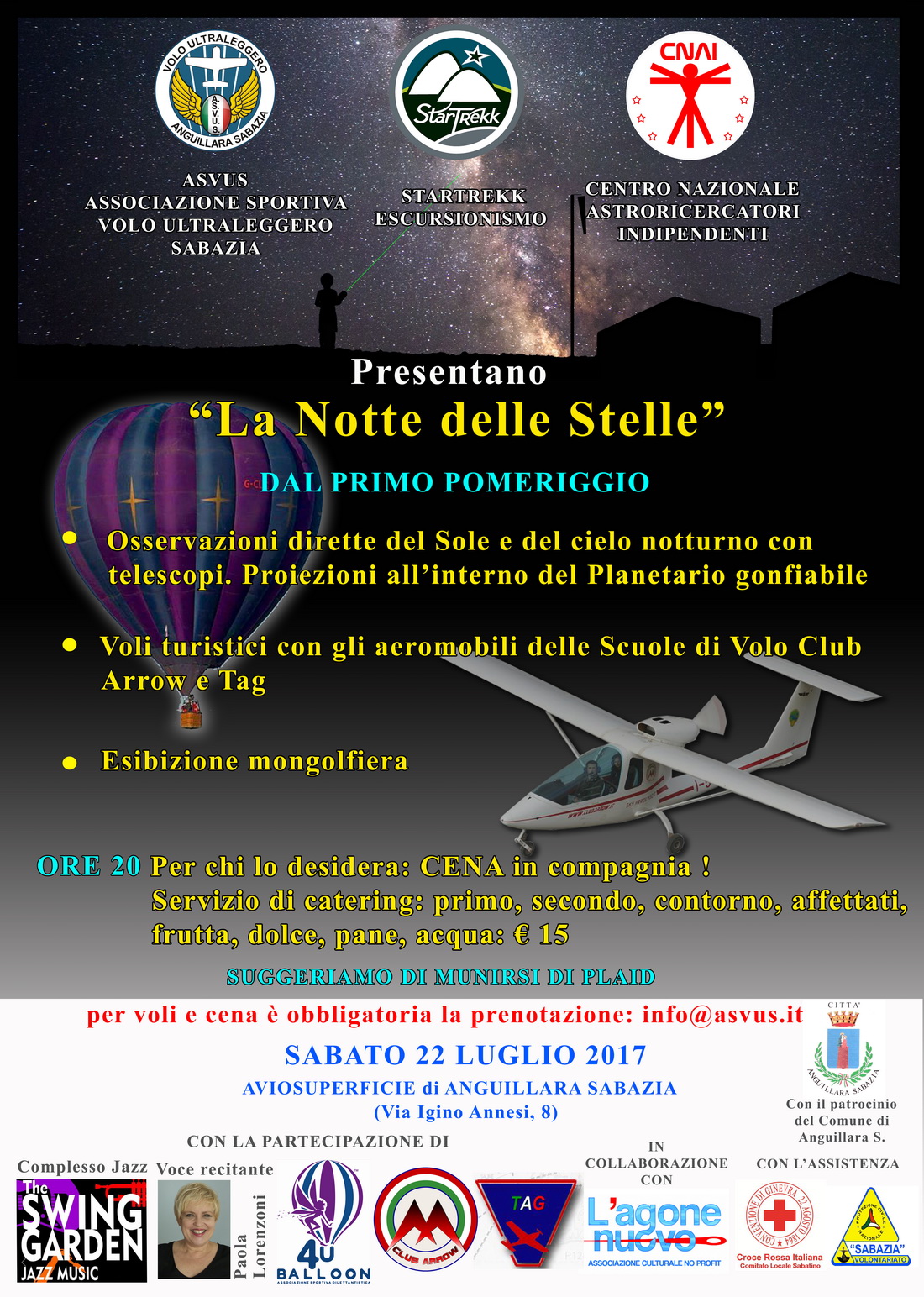 Sabato 22 Luglio, sull’aviosuperficie ASVUS di Anguillara Sabazia, a partire dal primo pomeriggio, sarà replicato l’evento la “Notte delle Stelle”, visto l’elevato indice di gradimento riscontrato nella edizione dello scorso anno.