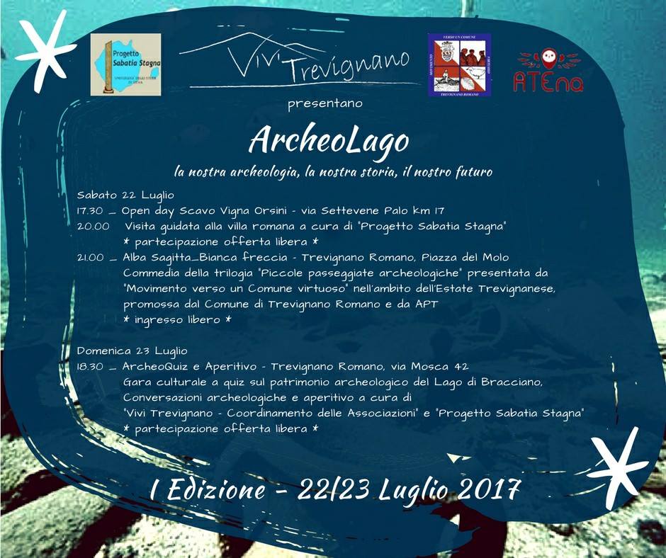 In occasione dei 10 anni del progetto di ricerche archeologiche “Sabatia Stagna” e della IV campagna di scavi in località Vigna Orsini (Bracciano), gli archeologi dell’equipe del prof. Cordiano (Università degli Studi di Siena), in collaborazione con il Coordinamento delle Associazioni – Vivi Trevignano, vi invitano alla I edizione di ArcheoLago, un week-end all’insegna dell’archeologia lacustre.