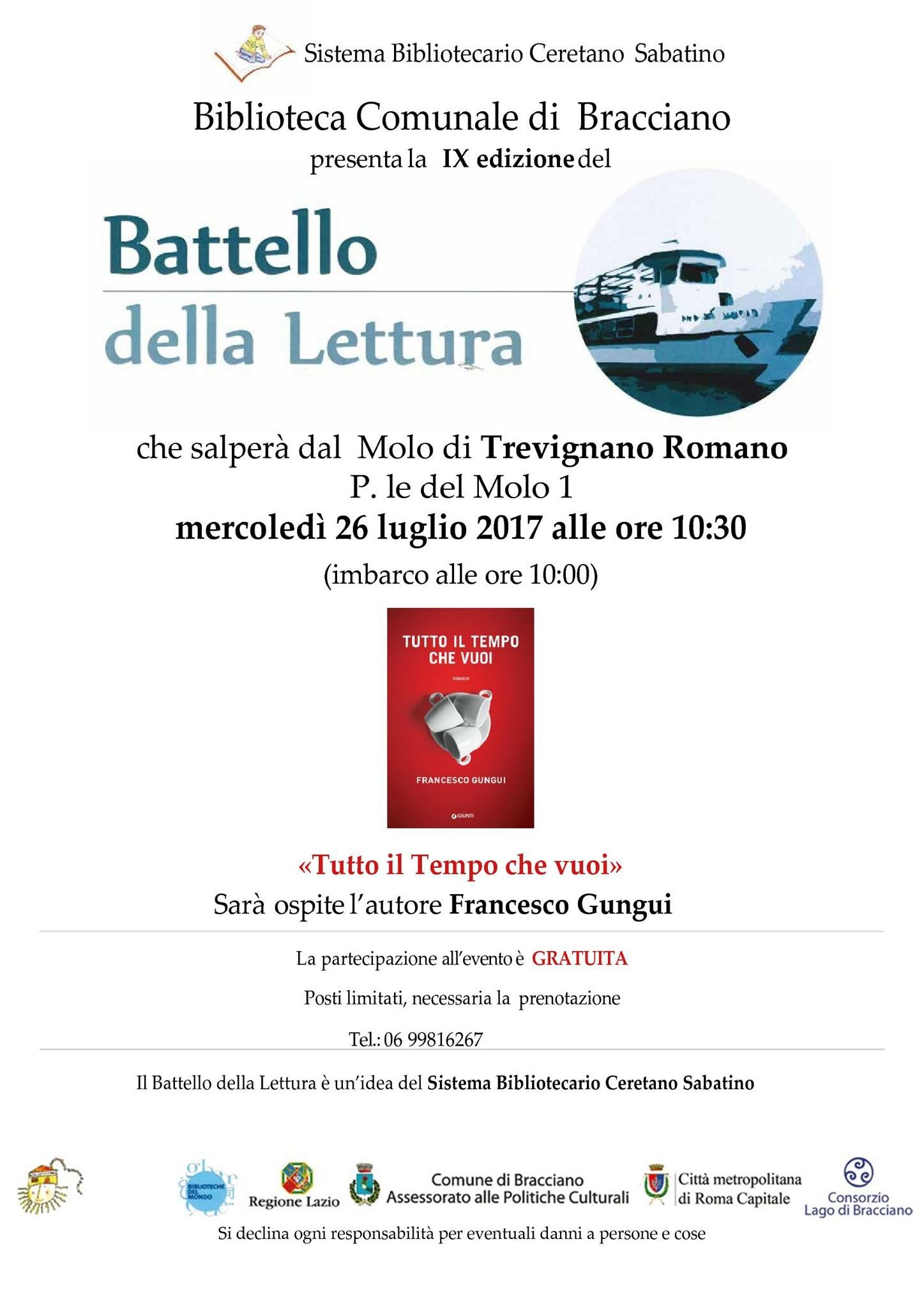 Il giorno 26 Luglio 2017 il Battello della Lettura salperà alle ore 10:30 dal Molo di Trevignano Romano, Piazzale del Molo 1, con imbarco alle ore 10:00. Sarà presentato il libro “Tutto il tempo che vuoi”, di Francesco Gungui, Ed.Giunti. L’autore interverrà all’evento come ospite.