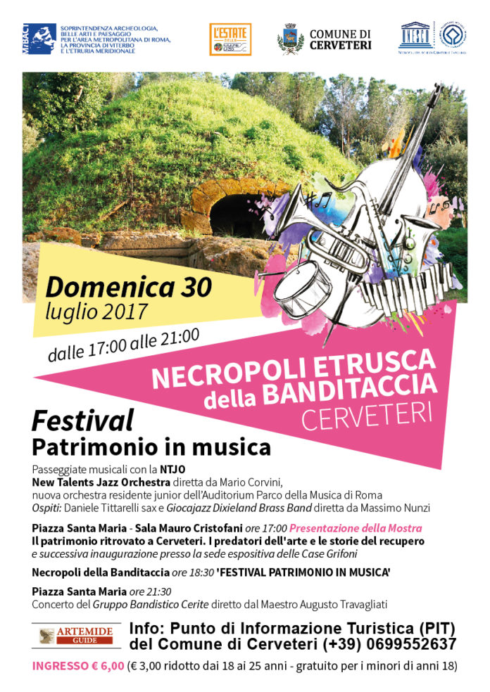 “Musica, storia, arte e archeologia: saranno questi i quattro elementi che caratterizzeranno l’ultima domenica di luglio – ha dichiarato Lorenzo Croci, Assessore allo Sviluppo Sostenibile del Territorio del Comune di Cerveteri – prosegue con il grande Jazz il ricco programma di eventi estivi organizzati alla Necropoli della Banditaccia all’interno della rassegna ‘Notti d’estate in Etruria’. Nel Centro Storico inoltre, nel pomeriggio taglio del nastro nei locali di Case Grifoni per la mostra ‘Il Patrimonio ritrovato a Cerveteri – I predatori dell’arte e le storie del recupero’, e in serata alle ore 21.30 l’attesissimo concerto del Gruppo Bandistico Caerite diretto dal M° Augusto Travagliati, che come consuetudine farà da apripista agli eventi culturali in programma per tutto il mese di agosto”.