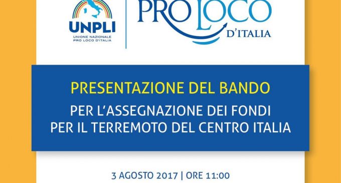 Saranno illustrati domani, 3 agosto, i contenuti del bando per l’assegnazione dei fondi raccolti dalle Pro Loco italiane a seguito degli eventi sismici che hanno colpito il Centro Italia (Abruzzo, Lazio, Marche e Umbria) nel 2016.