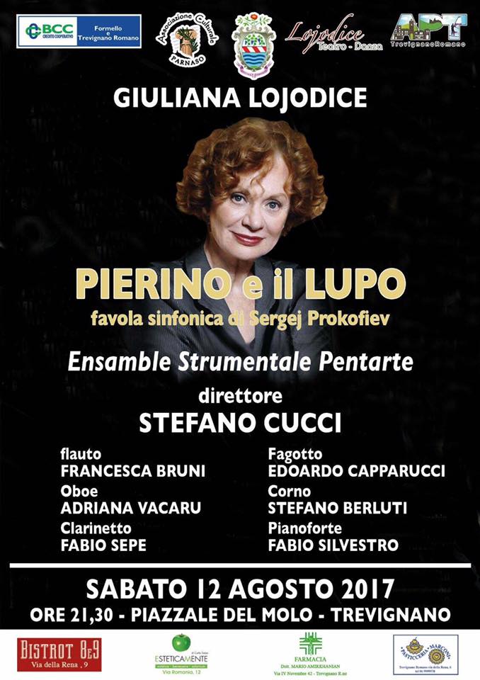 Sabato 12 agosto, nell’ambito della programmazione dell’estate trevignanese, appuntamento con una serata d’autore d’eccellenza, alle 21:30 nella splendida cornice di piazzale del Molo la celebre attrice Giuliana Lojodice e l’ Ensamble strumentale Pentarte diretto dal Maestro Stefano Cucci presentano la favola sinfonica “PIERINO e il LUPO” di Sergej Prokofiev.