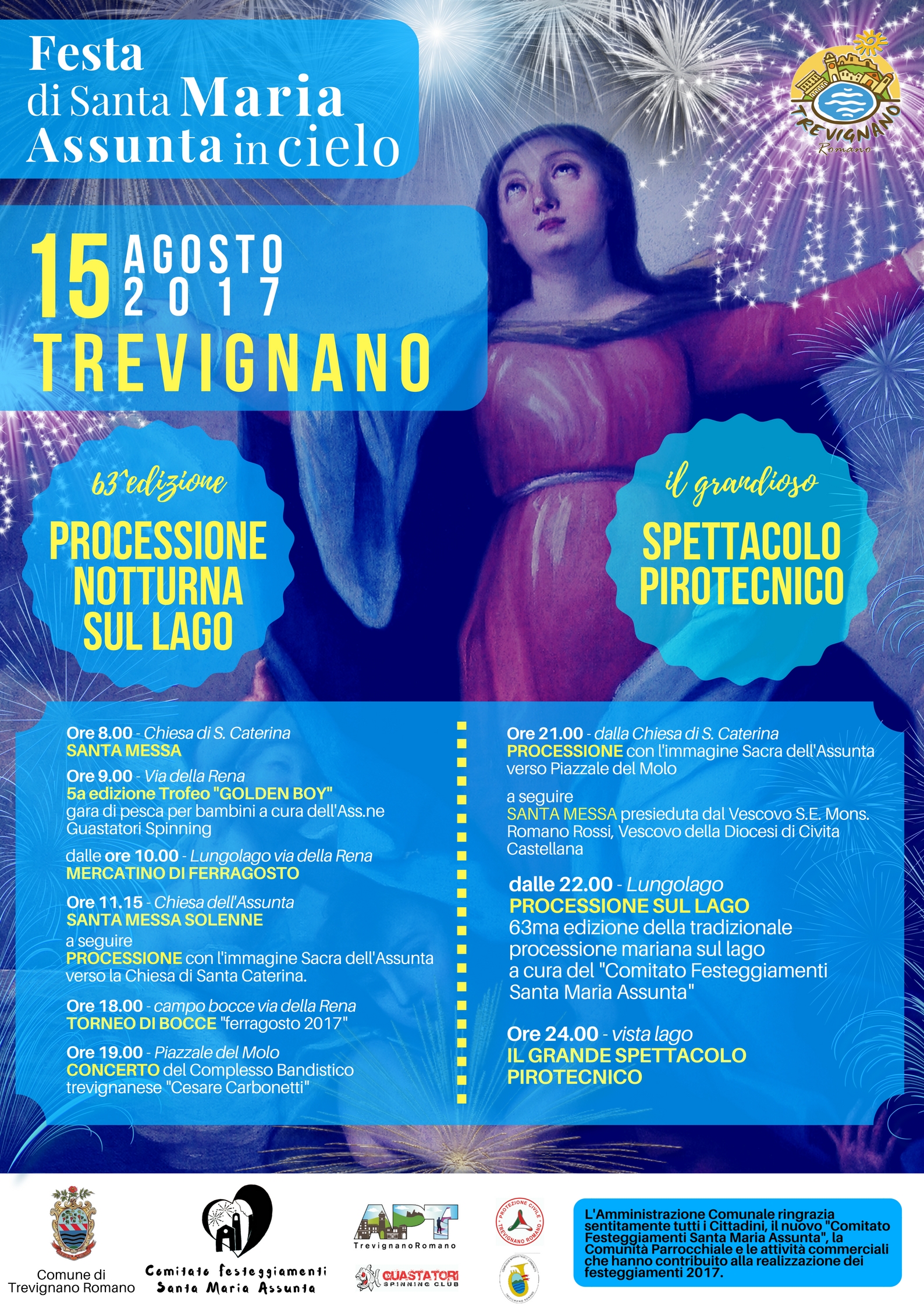 Il 15 agosto trevignanese oltre alle celebrazioni liturgiche che culmineranno con la celebrazione presieduta dal Vescovo della Diocesi di Civita Castellana Sua Eminenza Monsignor Romano Rossi, in piazzale del molo alle ore 21.00 vedrà le altre attività oramai ricorrenti con qualche sorpresa in più. Alle ore 9.00 i bambini potranno partecipare alla 5^ edizione della gara di pesca “trofeo golden boy” a cura dell’Associazione “Guastatori Spinning” e già dalle 10.00 turisti e ospiti di Trevignano potranno passeggiare tra gli espositori del mercatino del lago dispiegato sulla passeggiata Lungolago, alle 19.00 sul palco di piazzale del Molo invece sarà protagonista di un concerto bandistico il complesso trevignanese “Cesare Carbonetti” diretto da Maestro Francesco Consaga. Altri intrattenimenti estemporanei e a sorpresa animeranno le vie e il lungolago tra le tante e caratteristiche attività di ristorazione ed enogastronomia aperte per il pranzo e per la cena. Nella serata, a partire dalle 22.00, alla meraviglia dello scenario del lago di notte, illuminato dalle tante barchette addobbate di luci che solcheranno le acque seguendo la sua scia in processione, si potrà ammirare la “macchina” galleggiante che ospita l’allestimento suggestivo della Madonna Assunta in Cielo e le sue musiche sacre. Alle 24.00 invece, guardando sempre il lago si potrà assistere al rinnovato e grandioso spettacolo pirotecnico che insieme alla processione mariana hanno reso celebre negli anni il 15 agosto a Trevignano.