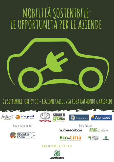 Siamo lieti di invitarla all’incontro promosso da Legambiente il 21 settembre mattino a Roma, con il patrocinio e la collaborazione di Regione, presso la sede della Regione Lazio, Via Rosa Raimondi Garibaldi 7, che ha lo scopo di illustrare le offerte di nuova mobilità, le modalità operative (contratti e convenzioni aziendali, servizi gestionali, amministrazione nella busta paga, detrazioni fiscali) e gli incentivi proposti ad imprese e dipendenti dalla Regione Lazio (per TPL, biciclette e e-bike).
