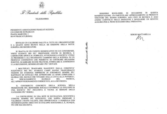 Un evento salutato positivamente anche dal Presidente della Repubblica, Sergio Mattarella che ha dichiarato: “Si tratta di un evento significativo, in cui conferenze, visite guidate nei più prestigiosi centri di ricerca e laboratori aperti al pubblico, avvicinano la società civile ai progressi e all’incessante cammino della scienza, in un confronto che permette di costruire relazioni positive, scambiare buone pratiche, sensibilizzare i più giovani. Il contributo concreto della scienza nella promozione del benessere sociale favorisce lo sviluppo di una società più inclusiva e vicina ai bisogni delle categorie più deboli. La costruzione di una rete di eccellenza scientifica comune sempre più efficiente, che sappia premiare e valorizzi i nuovi talenti, crei opportunità e persegua con determinazione obiettivi di sviluppo sostenibile è, dunque, più che mai decisiva. Desidero rivolgere, in occasione di questa manifestazione, un particolare apprezzamento ai progetti vincitori del bando europeo, agli enti di ricerca e agli atenei coinvolti nelle iniziative e rivolgere un sentito augurio per il pieno successo dell’iniziativa.”
