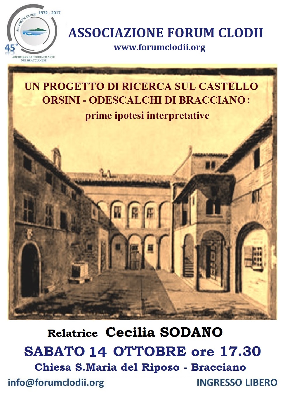 L’ Associazione Forum Clodii invita la cittadinanza alla conferenza di CECILIA SODANO su “ Un progetto di ricerca sul Castello Orsini Odescalchi di Bracciano: prime ipotesi interpretative”. L’evento si terrà Sabato 14 Ottobre 2017 ore 17.30 presso la Chiesa Santa Maria del Riposo, Via del Lago, Bracciano