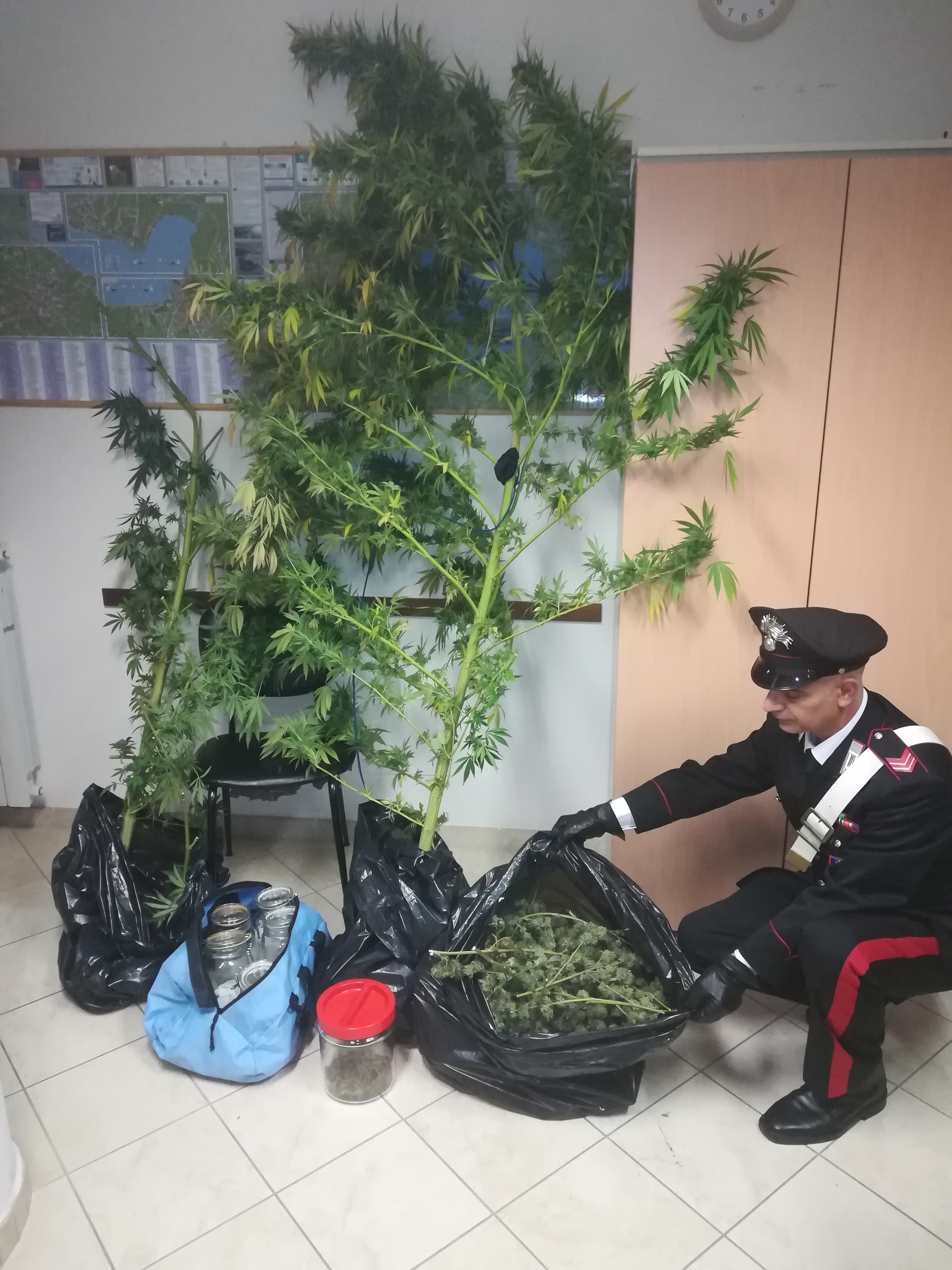 I militari, durante un giro di perlustrazione, hanno notato spuntare dal giardino di un’abitazione dei ciuffi di una pianta a dir poco sospetta. In seguito, hanno scoperto due piante di marijuana rigogliose, alte circa 2 metri e coltivate con estrema cura. Nel corso della perquisizione, i carabinieri hanno trovato anche una piccola serra, ricavata nel sottoscala della casa, al cui interno era custodito 1 chilogrammo di foglie di droga già essiccate, insieme al materiale necessario alla coltivazione ed il confezionamento in dosi per lo spaccio.