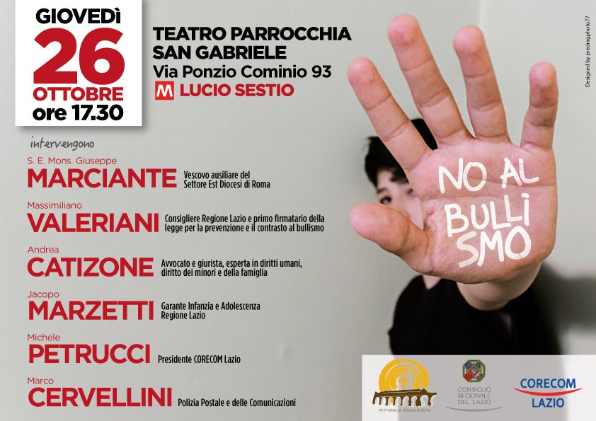 Il convegno sulla prevenzione e il contrasto del bullismo, in programma giovedì 26 ottobre alle ore 17.30 presso il nuovo Teatro della Parrocchia di San Gabriele, nel VII Municipio di Roma, nasce dall’esigenza di approfondire e conoscere la legge contro il fenomeno del bullismo approvata dalla Regione Lazio. Questa normativa (Il Lazio è la prima regione italiana ad averla varata) ha spinto la Parrocchia ad avviare un percorso con le diverse Istituzioni interessate per realizzare uno Sportello di Aiuto alle famiglie e ai giovani per contrastare il bullismo e ogni altro aspetto di disagio sociale in tutta la XX Prefettura della Diocesi di Roma.