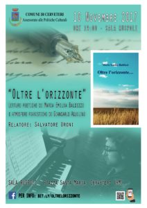 “Oltre l’orizzonte …”. È questo il titolo della terza raccolta di poesie che Maria Emilia Baldizzi, siciliana d’origine ma residente da tanti anni a Cerveteri, presenterà nei locali di Sala Ruspoli in Piazza Santa Maria alle ore 19.00 di venerdì 10 novembre.