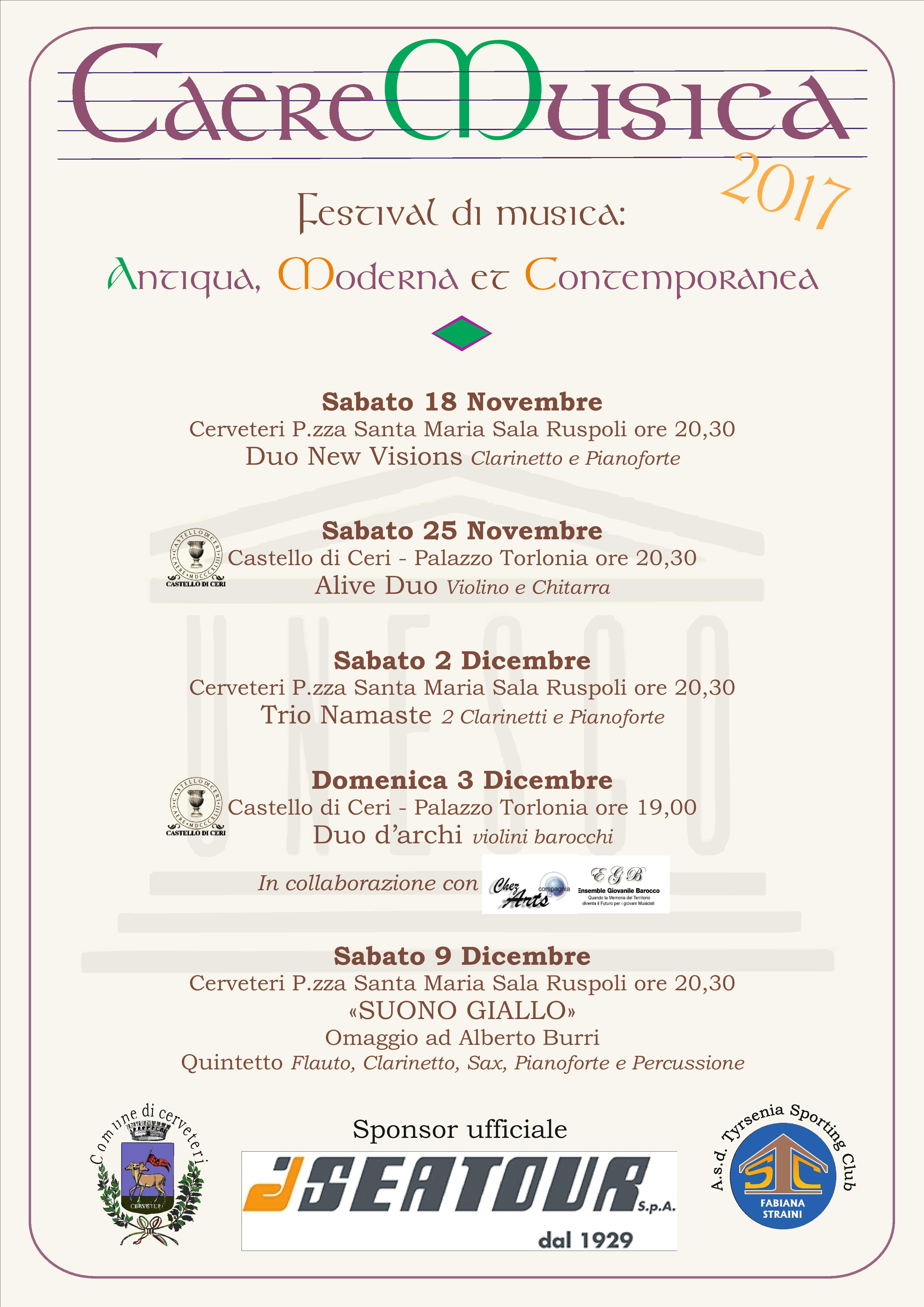 Cinque appuntamenti dal grande spessore artistico e culturale si svolgeranno a Cerveteri a partire da sabato 18 novembre. Si chiama ‘CaereMusica 2017’, il Festival di musica antica, moderna e contemporanea organizzato dal Consigliere comunale e Maestro di Musica Mauro Porro, con la collaborazione della Compagnia Chez Arts – Ensemble Giovanile Barocco, l’A.s.d. Tyrsenia Sporting Club e grazie alla disponibilità di Seatour S.p.A., Sponsor ufficiale della rassegna.
