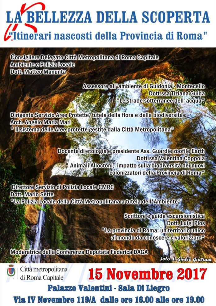 Mercoledì 15 novembre, presso la sala Mons. Di Liegro a Palazzo Valentini, Via IV Novembre 119/a, a partire dalle ore 16,00, si terrà l’incontro “La bellezza della scoperta, itinerari nascosti della Provincia di Roma”, su iniziativa del Consigliere delegato della Città metropolitana di Roma Capitale all’ambiente e polizia locale, Matteo Manunta.