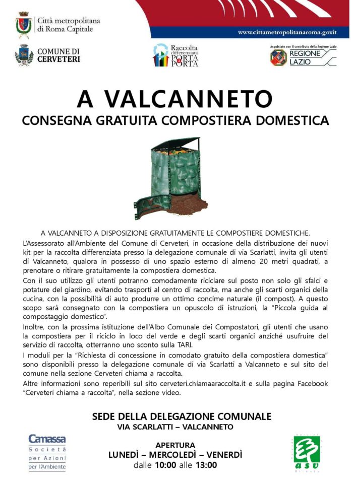 “A Valcanneto prende il via anche la distribuzione delle compostiere domestiche. Oltre alla consegna a domicilio dei nuovi kit per la raccolta differenziata, avviatasi nella mattinata di lunedì 13 novembre, la Camassambiente e ASV invitano gli utenti della frazione, qualora in possesso di uno spazio esterno di almeno 20 metri quadrati, a prenotare o ritirare gratuitamente la compostiera domestica. Con il suo utilizzo gli utenti potranno comodamente riciclare sul posto non solo gli sfalci e potature del giardino, evitando trasporti al centro di raccolta, ma anche gli scarti organici della cucina, con la possibilità di auto produrre un ottimo concime naturale, ovvero il compost”. Ad annunciarlo è Elena Gubetti, Assessora all’Ambiente del Comune di Cerveteri.
