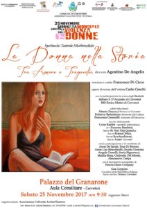 Sabato 25 novembre si celebra la Giornata internazionale per l’eliminazione della violenza contro le donne. Nell’Aula Consiliare del Granarone andrà in scena lo spettacolo teatrale multimediale ‘La Donna nella Storia, tra Amore e Tragedia’, un evento patrocinato congiuntamente dall’Assessorato alle Politiche Culturali e alle Politiche Sociali del Comune di Cerveteri e che vedrà la partecipazione attiva degli studenti degli Istituti Scolastici della Salvo D’Acquisto e dell’Enrico Mattei, oltre al contributo delle Associazioni SeNonOraQuando, Maraa Onlus, Scuolambiente, Auser Cerveteri, della Cooperativa Karibù dello Sportello Antiviolenza, dell’Avvocato Susanna Bambini e di diverse personalità della cultura, dell’arte, dell’associazionismo e della società civile di Cerveteri.