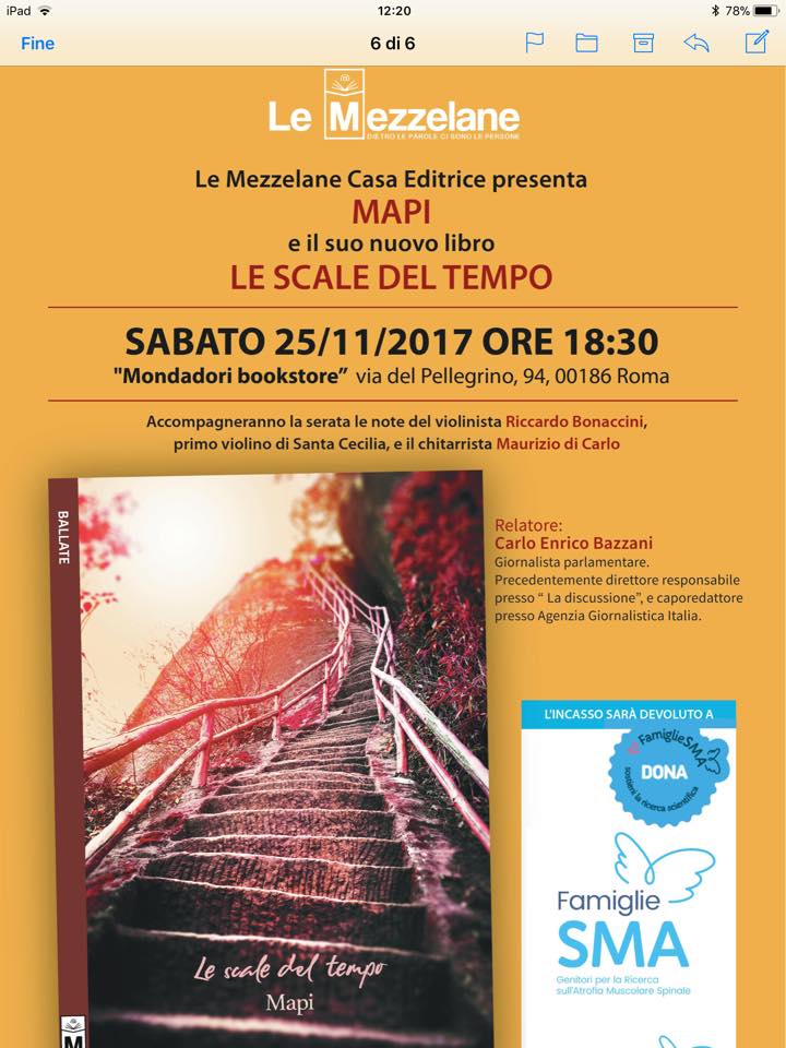 L’ultima raccolta poetica di Mapi, intitolata “Le scale del Tempo”, verrà presentata sabato 25 novembre a Roma presso la libreria GIT Mondadori in via del Pellegrino 94. La silloge di Mapi comprende 50 poesie con prefazione di Giusy Cuceli e postfazione di Carlo Enrico Bazzani, ed è pubblicata dalla casa editrice marchigiana Le Mezzelane. Importante sottolineare che l’intero ricavato della vendita verrà devoluto all’associazione Famiglie SMA, la Onlus nata nel 2001 per costituire un punto di riferimento per medici, ricercatori scientifici e nuclei familiari con figli colpiti da atrofia muscolare spinale.