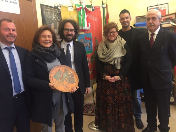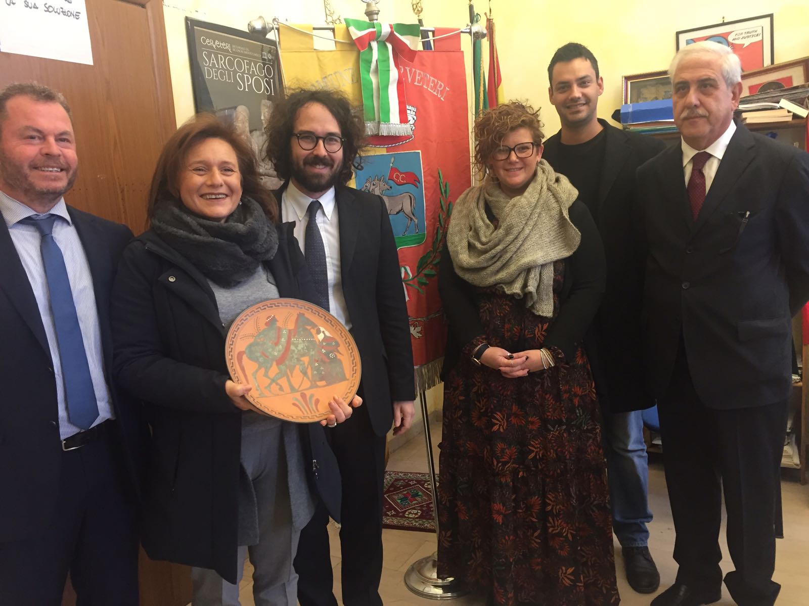 La Presidente della Comunità Ruth Dureghello prima di recarsi all’istituto Enrico Mattei è stata accolta in Municipio dal Sindaco Alessio Pascucci, dalla Giunta Comunale di Cerveteri, dal Segretario Generale Dottor Pasquale Russo e dalla Consigliera comunale Anna Maria Costantini, e le è stato donata una meravigliosa riproduzione artistica realizzata da Roberto Di Berardino. A seguire, la visita al Museo Nazionale Caerite e ai Capolavori di Eufronio, la Kylix e il Cratere.