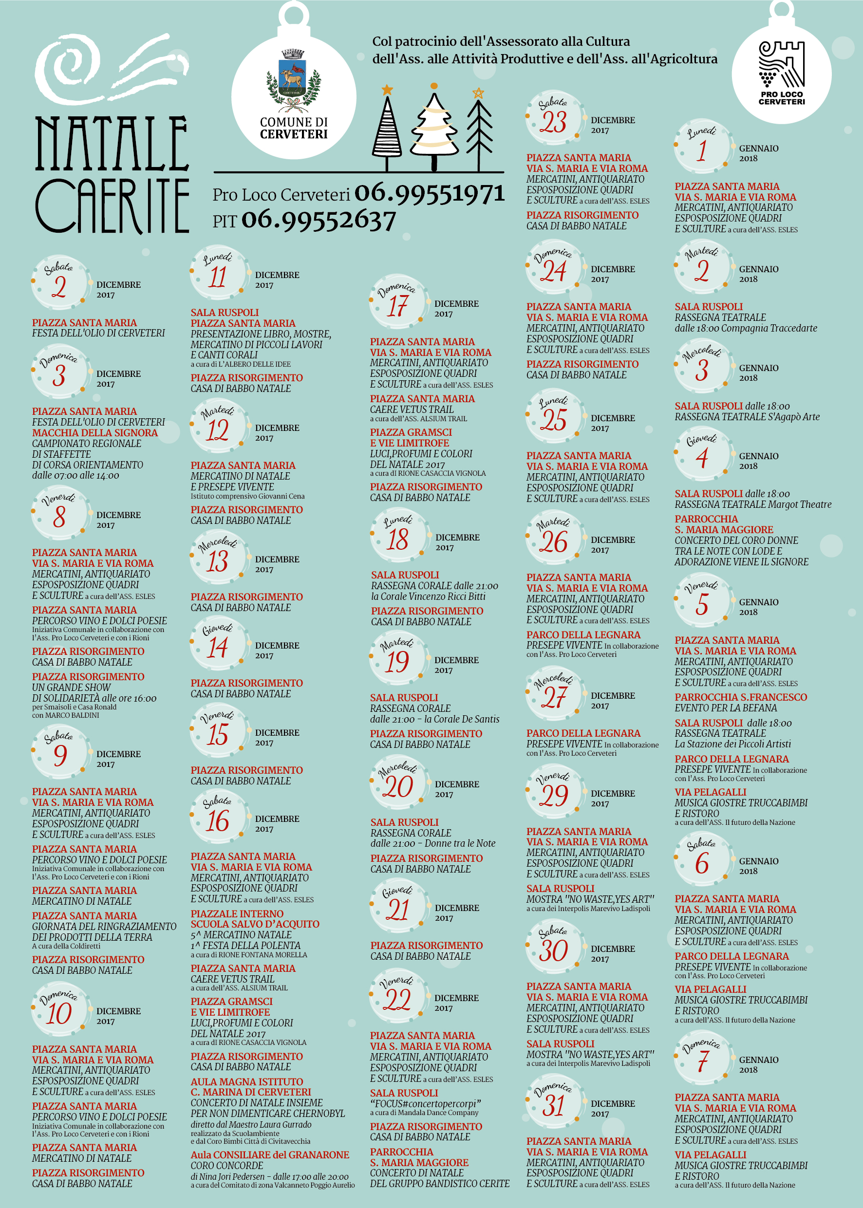 Festa dell’Olio Nuovo, la Casa di Babbo Natale in Piazza Risorgimento con accanto un Parco Giochi permanente per tutto il periodo delle feste, mercati di antiquariato, rassegne corali e di danza, il tradizionale concerto del Gruppo Bandistico Caerite e l’immancabile appuntamento con il Presepe Vivente.