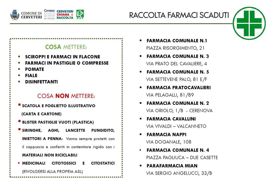 “I luoghi e le modalità di conferimento dei farmaci scaduti sono tra le maggiori domande che quotidianamente ci vengono rivolte da parte dell’utenza. Per questo insieme all’ATI del Servizio di Igiene Urbana, abbiamo avviato una campagna dove vengono illustrate tutte le informazioni su questo tipo di rifiuti speciale”. A dichiararlo è Elena Gubetti, Assessora all’Ambiente del Comune di Cerveteri.