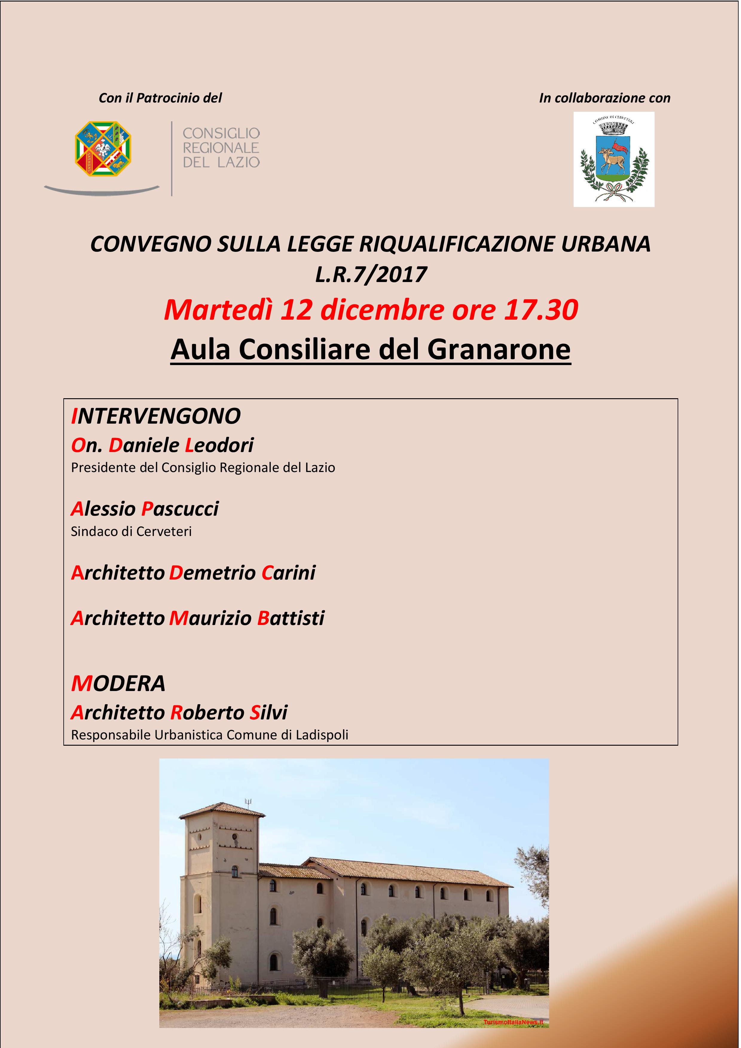 Un interessante convegno che la Presidenza del Consiglio Regionale del Lazio organizza a Cerveteri. Oggetto dell’evento, la Legge di Riqualificazione Urbana del Luglio 2017 approvata al Palazzo della Pisana dalla Giunta guidata dal Governatore Nicola Zingaretti.