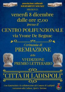 Venerdì 8 dicembre, a partire dalle ore 17:00, presso la sala polifunzionale di via De Begnac, si procederà alla consegna degli attestati, targhe, buoni libro, offerti per la sezione scuola da Caffè Tondì e premi in denaro per le sezioni narrativa, racconto e poesia dal Centro Studi Arcadia.