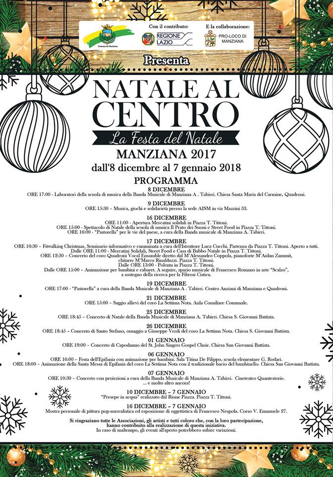 Da venerdì 8 dicembre a domenica 7 gennaio il Comune di Manziana, con il contributo della Regione Lazio e la collaborazione della Proloco Manziana e delle associazioni e degli artisti che hanno aderito al progetto, organizza “NATALE AL CENTRO“, un cartellone ricco di eventi di tutti i tipo ma che mostra una particolare attenzione al sociale.