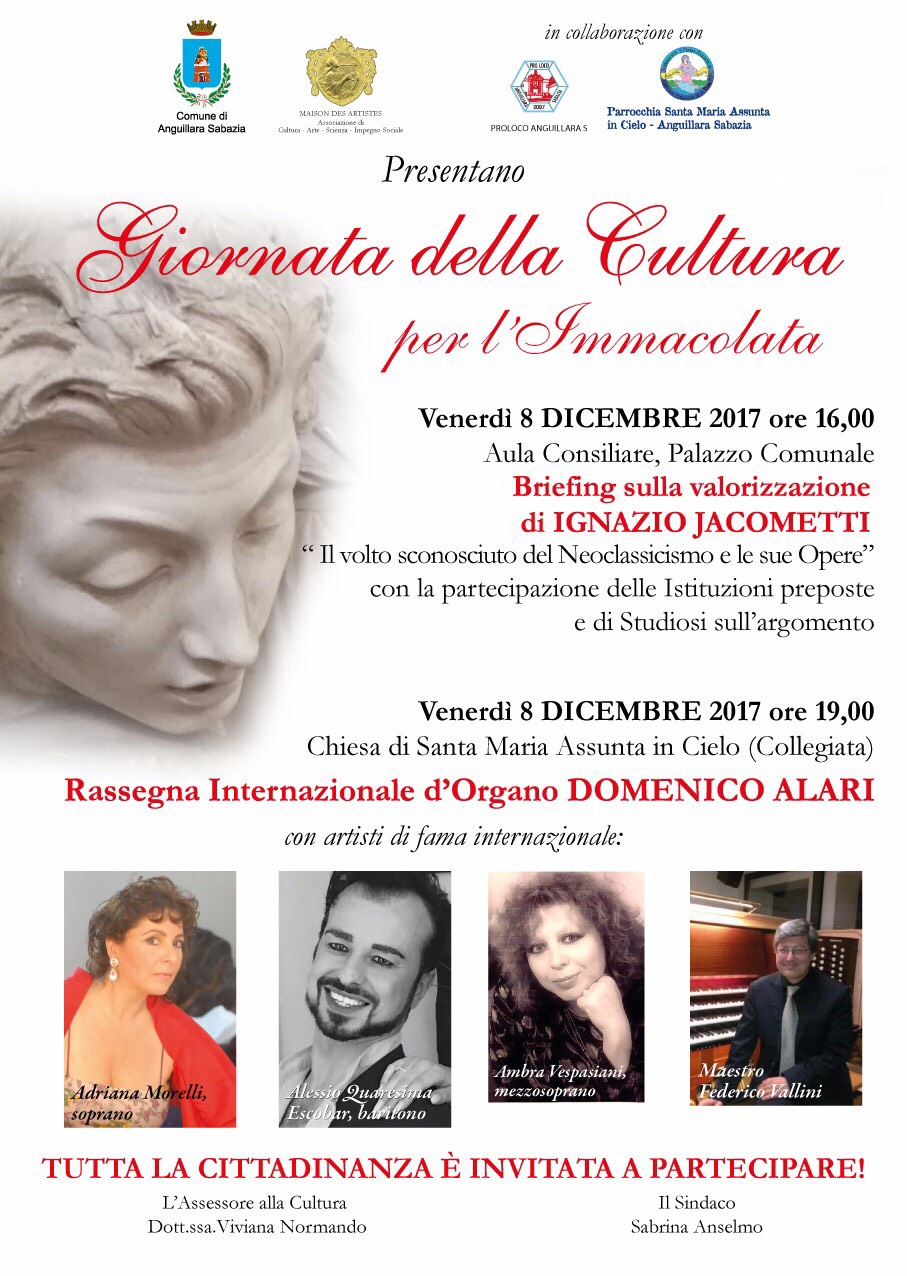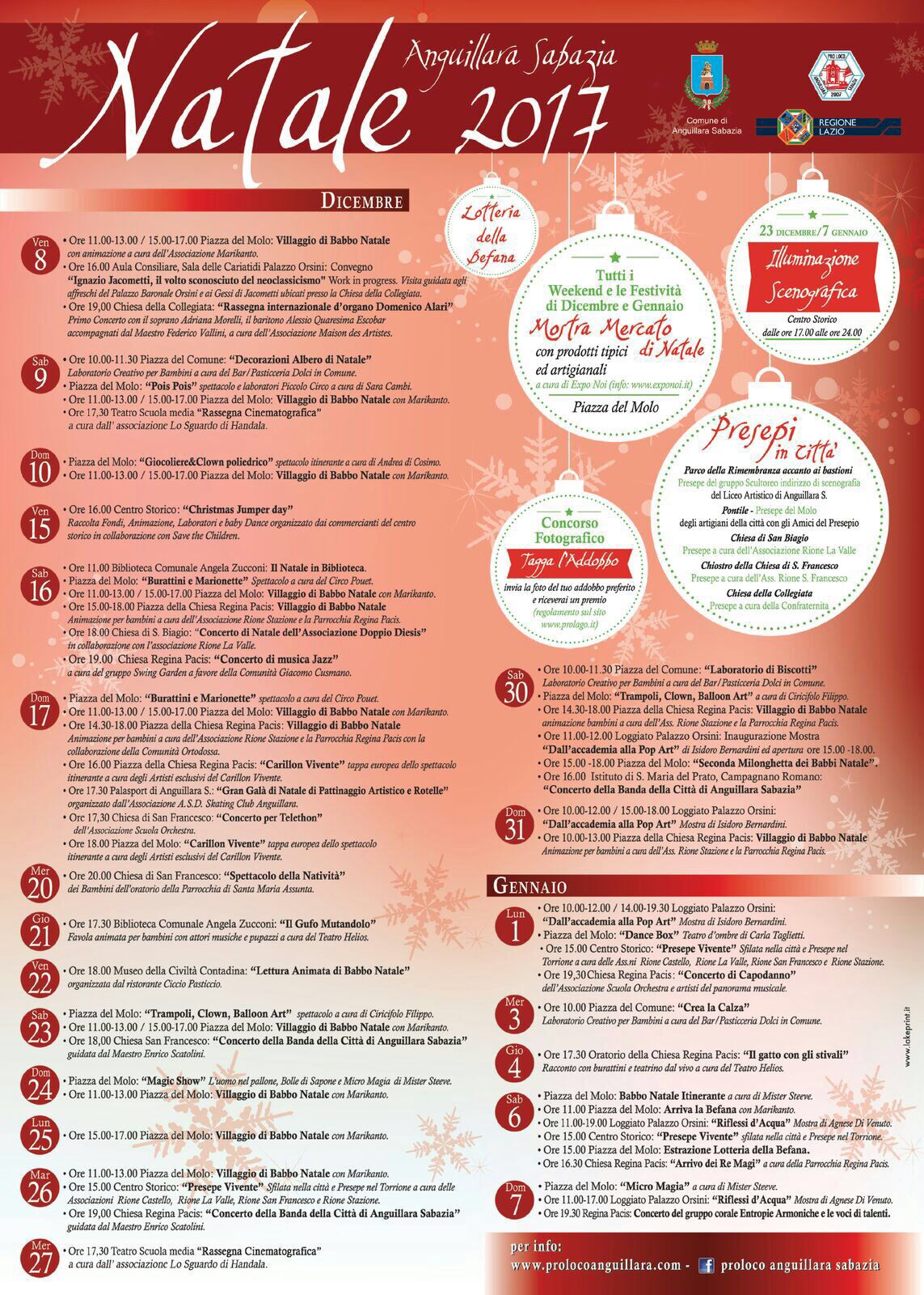 Parte oggi il magico Natale di Anguillara! Dal giorno dell’Immacolata prende avvio il magico Natale 2017 di Anguillara Sabazia con il villaggio di Babbo Natale e i laboratori didattici per i più piccoli in piazza del Molo, con concerti di prestigio come quello stasera della Maison des Artistes nella Chiesa della Collegiata con interpreti e artisti d’eccezione in ambito internazionale, con appuntamenti culturali, mostre mercato di prodotti artigianali e tipici di Viaggia Italia aps, con la mostra dei presepi napoletani di San Gregorio armeno, con le mostre nel palazzo Orsini di Isidoro Bernardini e di Agnese Di Venuto, con il presepe vivente inserito negli itinerari del Lazio a cura dei Rioni nei suggestivi giardini medievali rinascimentali del torrione, con il cineforum e gli appuntamenti a testimonianza dell’unione di Anguillara al mondo che iniziano nel weekend end dell’Immacolata dal 9 dicembre, con il Natale in Biblioteca all’animazione, con il carillon vivente insieme agli artisti esclusivi con Anguillara tappa di un tour europeo che si concluderà a Madrid, a tantissimi altri eventi nel centro storico e nel piazzale della Chiesa di Regina Pacis, ludici e di riqualificazione interessante dei beni culturali splendidi della città. Vi aspettiamo numerosi! Per info: www.prolocoanguillara.com e www.comune.anguillara-sabazia.roma.it.