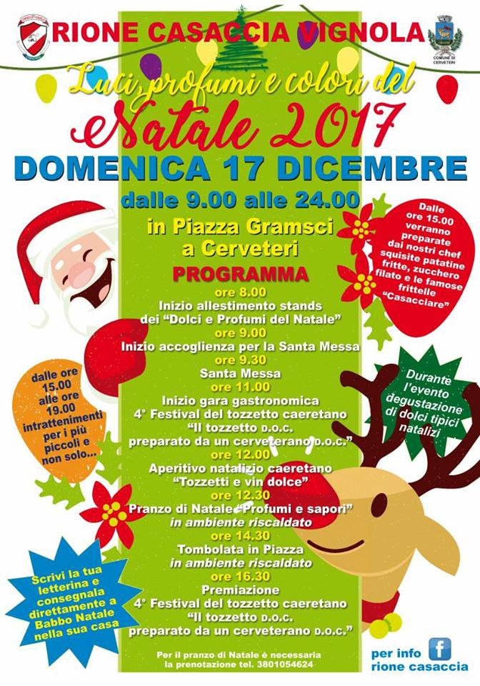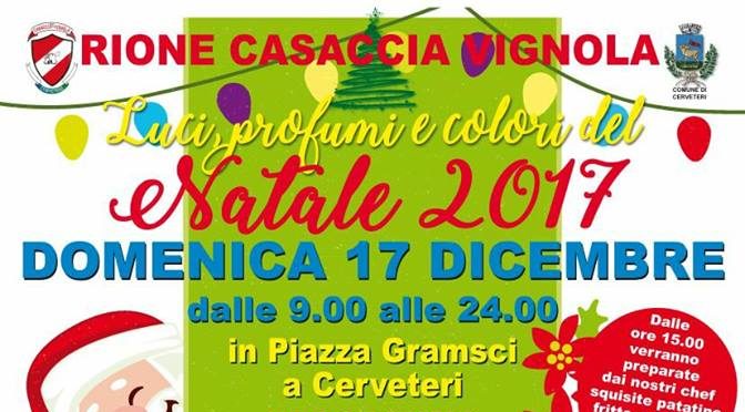 Come tradizione, il Natale di Cerveteri sarà rallegrato da ‘Luci, profumi e colori del Natale 2017’, l’iniziativa organizzata dal Rione Casaccia Vignola che per l’intera giornata allieterà famiglie, grandi e piccoli con intrattenimento, stand gastronomici e spettacoli natalizi.