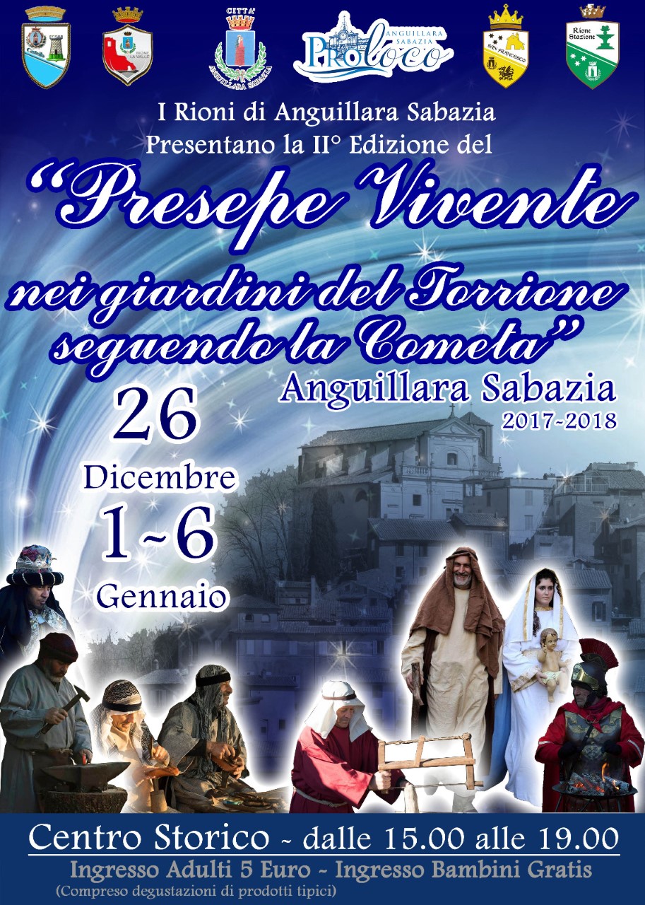 Anche quest’anno i quattro Rioni storici di Anguillara Sabazia (La Valle, Castello, San Francesco, La Stazione), con la collaborazione dell’Ass.ne Pro Loco, in occasione del Natale 2017, daranno vita alla 2° edizione del Presepe Vivente. La rappresentazione si svolgerà nei suggestivi Giardini del Torrione Medioevale nei giorni di martedi 26 dicembre – 1 e 6 gennaio dalle ore 15.00 alle 18.00; i visitatori inoltre potranno visitare l’adiacente Palazzo Baronale, il Museo Storico della Civiltà Contadina e seguendo un percorso tra i vicoli nel centro storico del Paese, dove saranno allestite delle grotticelle con degustazione di prodotti tipici locali, giungere sino alla Chiesa della Collegiata.