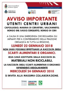 Elena Gubetti, Assessora all’Ambiente del Comune di Cerveteri, rende noto che a causa di un’emergenza che riguarda gli impianti per il conferimento della Frazione organica in tutta la Regione, motivi non dipendenti dunque dall’Amministrazione comunale, nella giornata di lunedì 22 gennaio nei Centri Urbani di Cerveteri capoluogo, Marina di Cerveteri, Borgo del Sasso e nella adiacente zona del Cerqueto e al Borgo di Ceri non verrà effettuata la raccolta degli scarti alimentari ed organici.