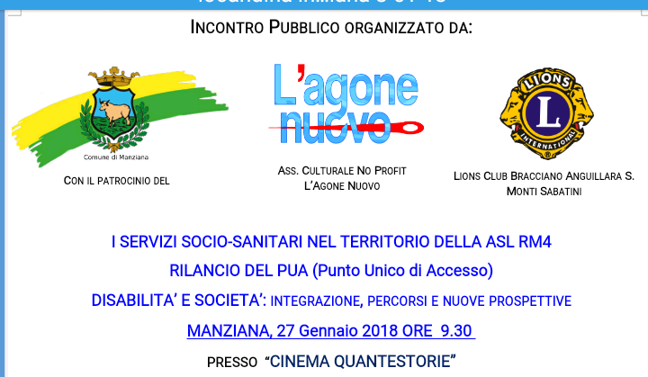 L’Associazione “L’Agone Nuovo” insieme al “Lions club Bracciano Anguillara S. Monti Sabatini” e al comune di Manziana è lieta di invitare tutti i cittadini del comprensorio all’incontro pubblico sulla condizione dei servizi socio-sanitari e per il rilancio del PUA (Punto Unico di Accesso) a Manziana, il giorno 27 Gennaio alle 9.30 presso il cineteatro Quantestorie.