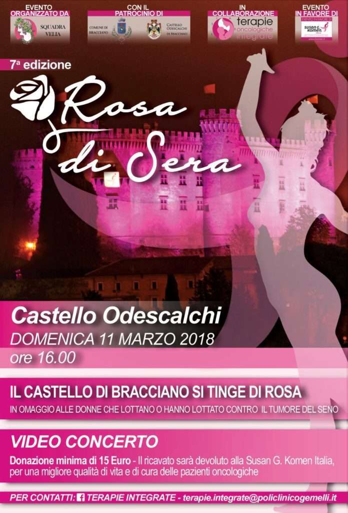 Il Castello di Bracciano si tinge di rosa. La Susan G. Komen Italia e la Squadra di Velia per la Race for the Cure con il patrocinio del comune di Bracciano sono liete di annunciare la 7° edizione di “Rosa di Sera”, in omaggio a tutte le donne che affrontano la patologia tumorale.