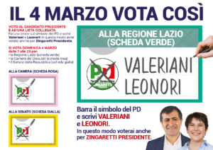 Per le elezioni regionali (scheda verde) puoi esprimere il voto al candidato presidente e ad una lista collegata facendo una croce sul simbolo del PD e scrivendo accanto due preferenze Valeriani e Leonori.