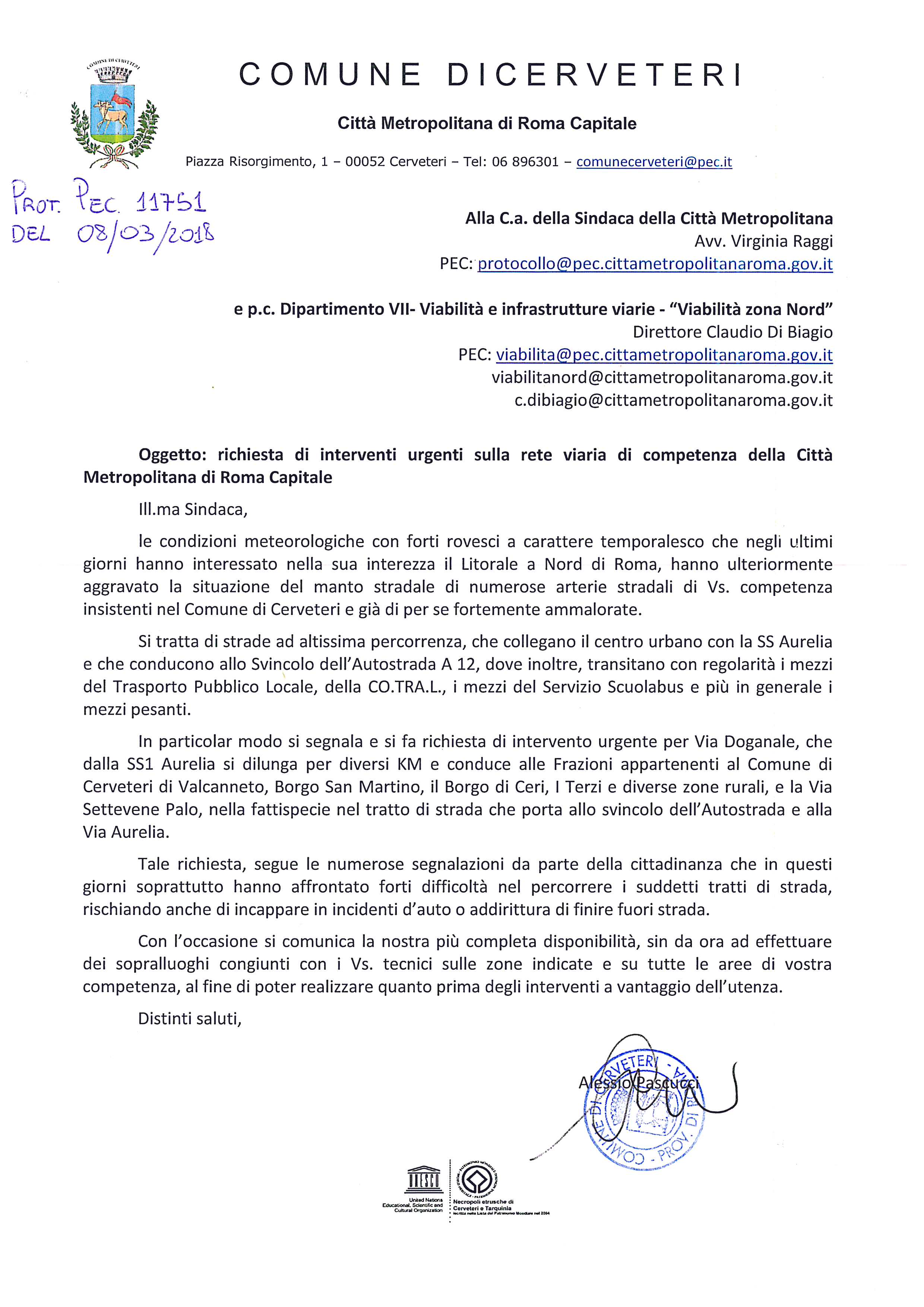 “Le condizioni del manto stradale di Via Doganale e del tratto di Via Settevene Palo che unisce Cerveteri capoluogo allo svincolo autostradale e alla Via Aurelia sono drammatiche. Nonostante le numerose richieste inviate da parte dei nostri Uffici all’attenzione della Città Metropolitana di Roma Capitale, Ente che si occupa della manutenzione di queste due importanti arterie stradali, non sono mai stati effettuati interventi concreti. Le forti piogge che negli ultimi giorni hanno interessato l’intero Litorale a Nord di Roma hanno ulteriormente aggravato la situazione, compromettendo la viabilità e la sicurezza di molti automobilisti”. Lo ha dichiarato Alessio Pascucci, Sindaco di Cerveteri e Consigliere della Città Metropolitana di Roma Capitale, che nella giornata di ieri, giovedì 8 marzo, ha inoltrato una lettera ufficiale alla Sindaca Metropolitana Virginia Raggi con la quale richiede interventi urgenti sulla rete viaria di competenza dell’Ente Metropolitano.
