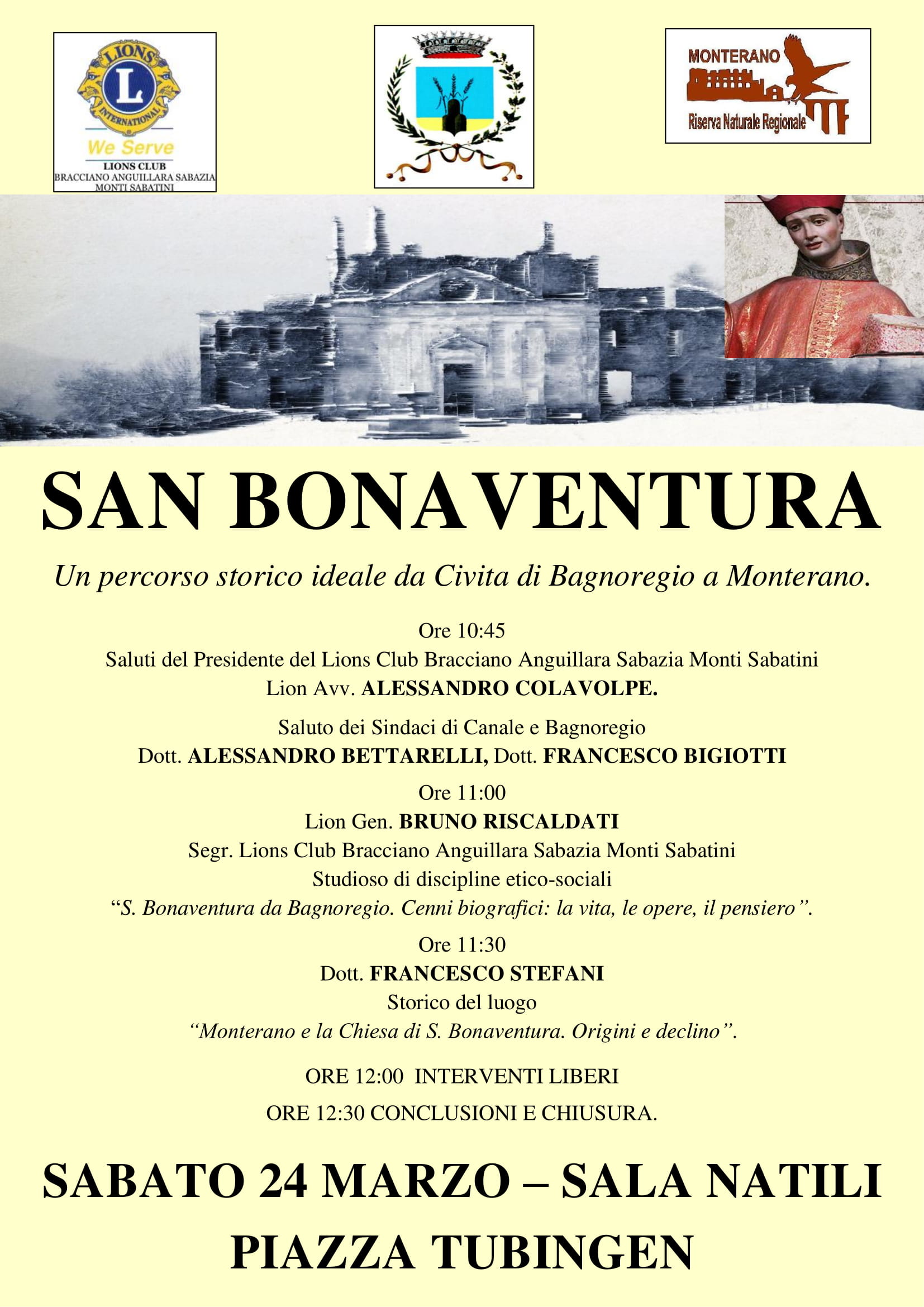 Sarà poi la volta dei relatori. Aprirà il Lion Gen. Bruno Riscaldati, Segr. Lions Club Bracciano Anguillara Sabazia Monti Sabatini, studioso di discipline etico-sociali parlando del tema: “S. Bonaventura da Bagnoregio. Cenni biografici: la vita, le opere, il pensiero”.