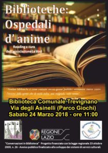 Sabato 24 marzo ore 11 in occasione, invece, della “Giornata nazionale della promozione della lettura” si terrà, sempre nella biblioteca di Trevignano, l’incontro Biblioteche: Ospedali d’Anime. Reading e immagini a cura dell’ass. “Le Voci”.