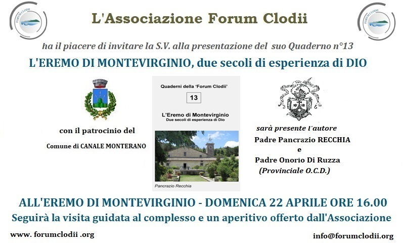L’associazione Forum Clodii è lieta di invitarvi alla presentazione “L’Eremo di Montevirginio, due secoli di esperienza di Dio”. L’evento è organizzato con il patrocinio del Comune di Canale Monterano. Sarà presente l’autore, padre Pancrazio Recchia e padre Onorio di Ruzza.