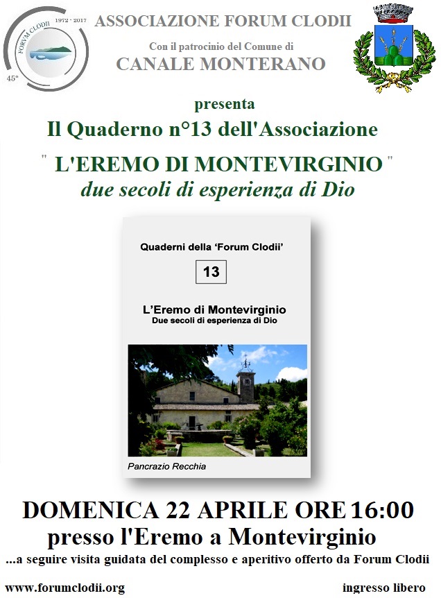 L’Associazione Forum Clodii, con il patrocinio del Comune di Canale Monterano, invita la cittadinanza Domenica 22 Aprile 2018 ore 16.00 presso l’Eremo di Montevirginio, alla presentazione del 13° Quaderno della ’Forum Clodii’ dal titolo “L’Eremo di Montevirginio, Due secoli di esperienza di Dio”, ristampa del testo del frate carmelitano Pancrazio Recchia con nuova prefazione del Prof. Saverio Sturm.